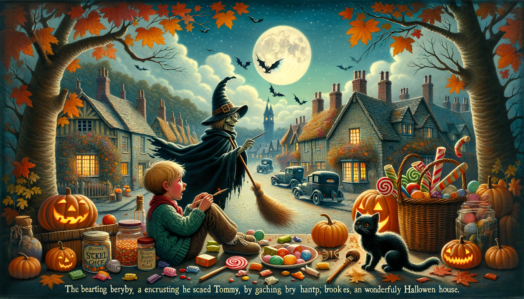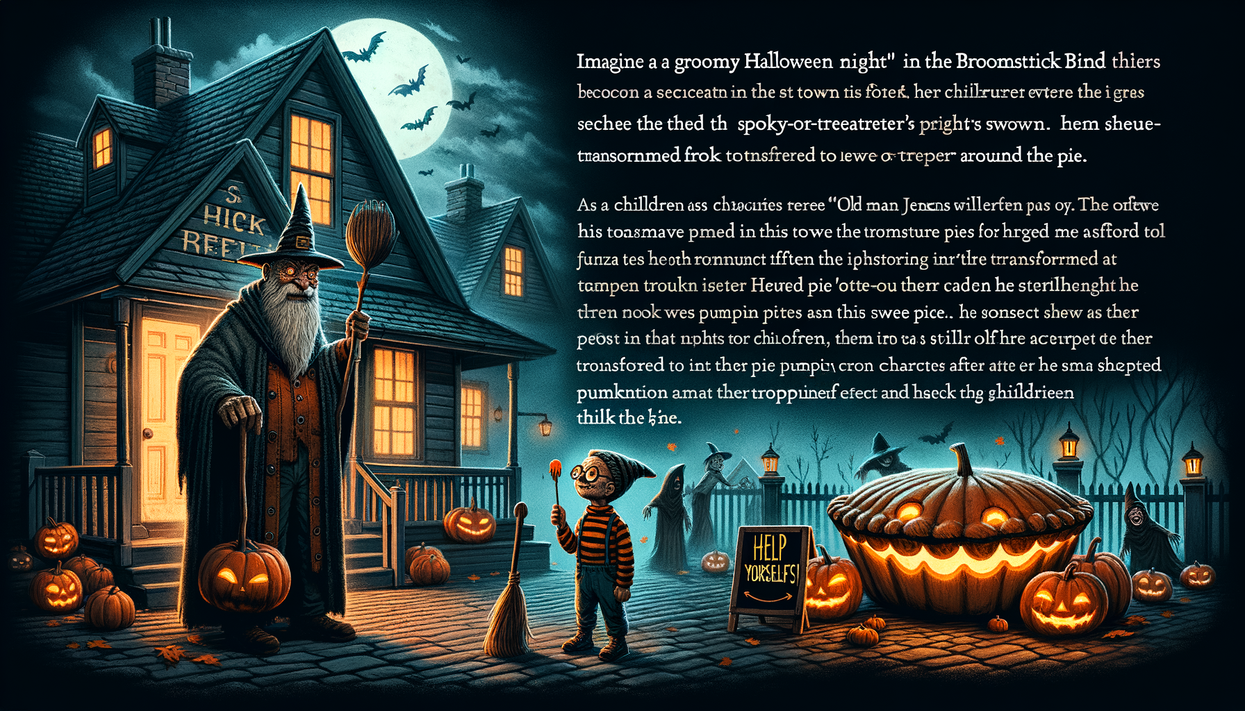 On a cold, ominous Halloween night, in the equally foreboding town of Broomstick Bend, lived a peculiar character, known simply as “Old Man Jenkins”. Renowned for his spine-chilling tales of the supernatural, he had a great love for pumpkin pie and an even greater hatred for trick or treaters. On this particular night, he set about a mischievous plan.