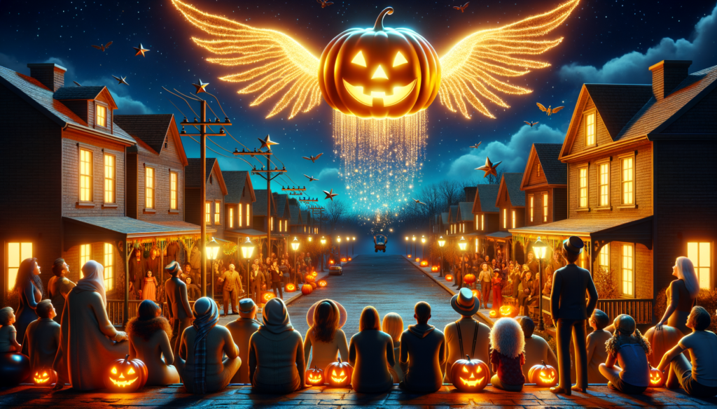 With magnificent grace, it flew above the village, casting a warm, golden hue over the astonished faces below. It swooped down, circled around the streets, and within the blink of an eye vanished into the night, leaving behind a trail of sparkles that formed the words, “Happy Halloween!” in the sky.