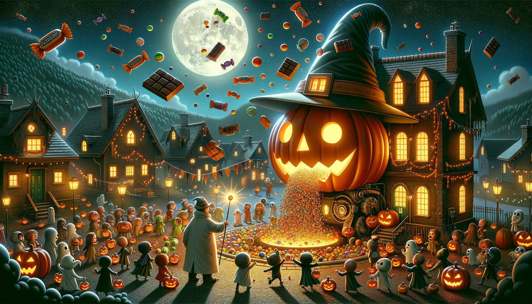 On Halloween eve, in the small town of Spookville, lived a quirky scientist named Professor Broom. He had a secret lab under his witch’s hat-shaped house where he invented unusual gadgets. This year, Broom decided to create ‘Candy-iosk,’ a candy-dispensing robot. The townsfolk chuckled with excitement.