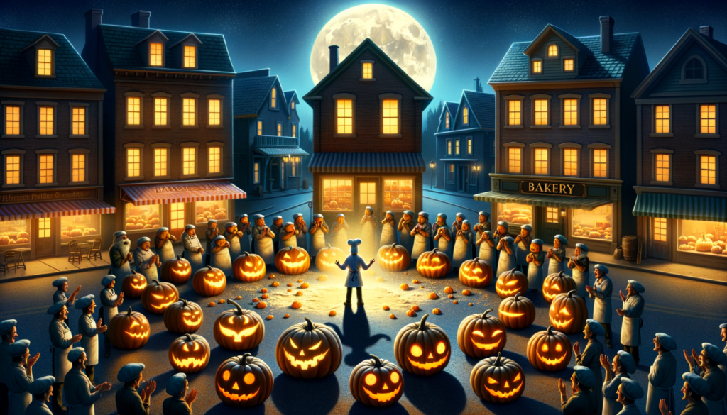 Polo stood, frozen with his flour-dusted apron, as the pumpkin parade headed his way. Stunned into silence, he blankly watched the spectacle unfold. Suddenly, the pumpkins beamed and formed a large heart shape in front of his bakery. The biggest pumpkin then merrily proclaimed, “We, the pumpkins, decree Polo our pumpkin king!” In unison, they all hopped, creating a spectacle of light and shadow across the town.